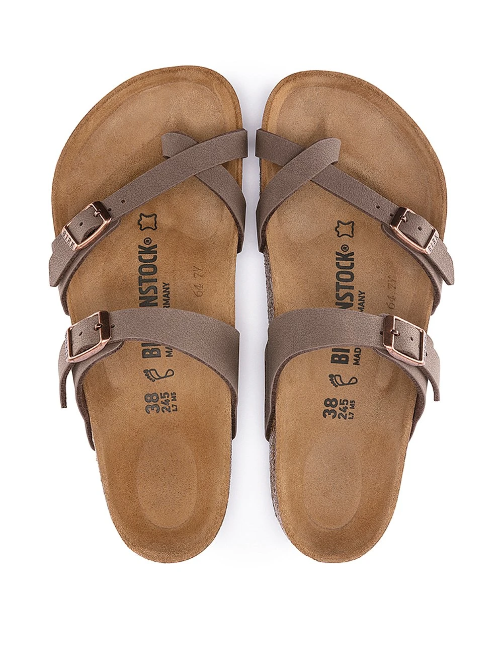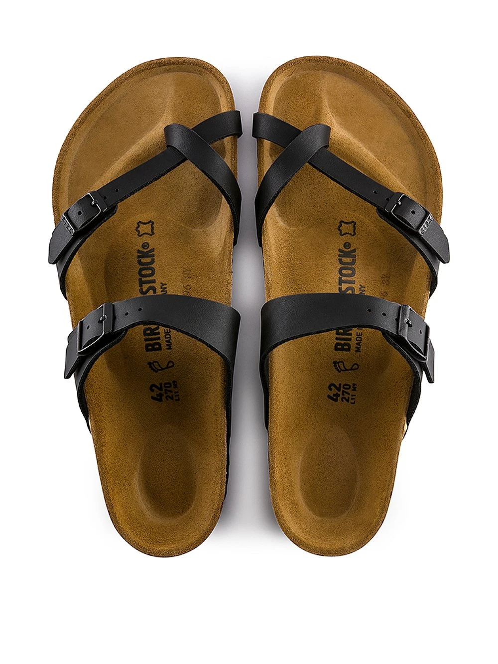 Supremely comfortable with sophisticated, crisscross straps, the Mayari redefines the thong sandal with a single toe loop. Complete with classic BIRKENSTOCK design elements, like adjustable buckle closures and a contoured footbed for the ultimate in support.