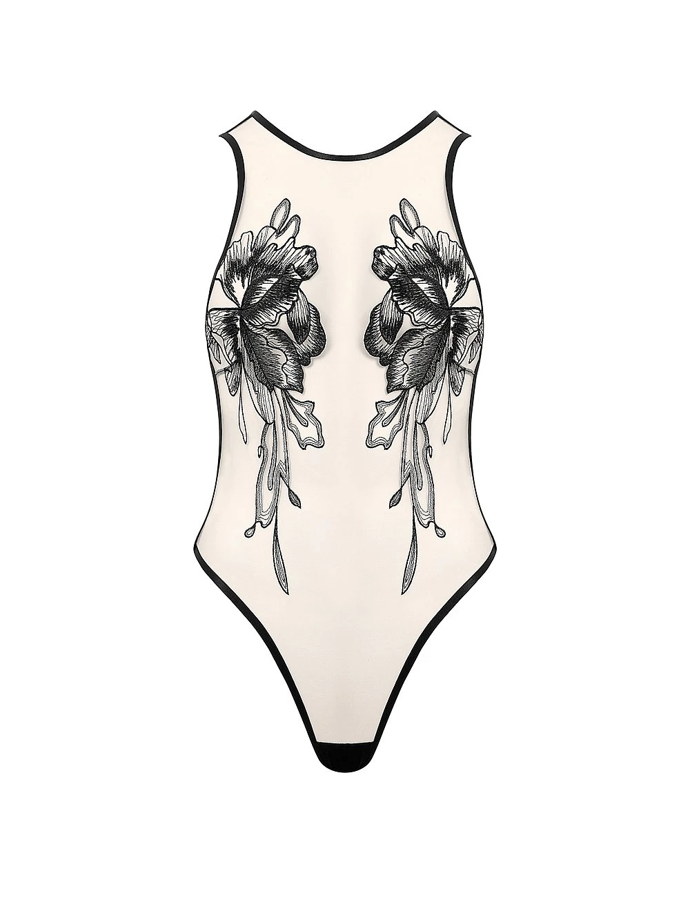 Crafted from supersoft, sheer mesh, this chic Bodysuit boasts intricate floral embroidery, contrasting seams, and a glamorous back cutout detail.