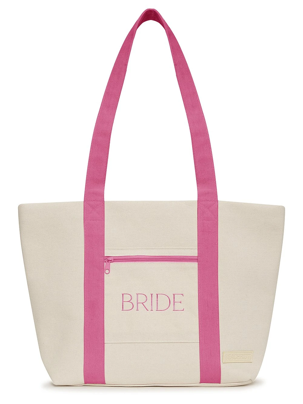 Fit your wedding or bachelorette essentials in this fun Tote that features a “bride” message (so everyone knows you’re the VIP) and cute, contrasting shoulder straps. An exterior side-slip pocket with zip closure allows for easy access to your necessities, while keeping them safe.