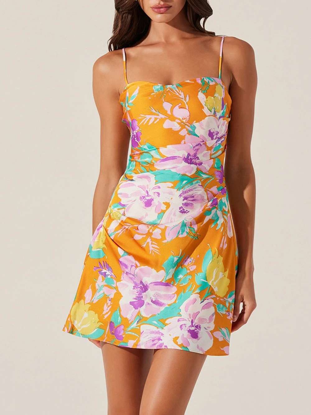 Rendered in soft satin, this fun mini Dress has adjustable straps, ruched sides, and plenty of statement-making flair.