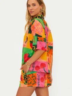- Color block design with tropical motifs
