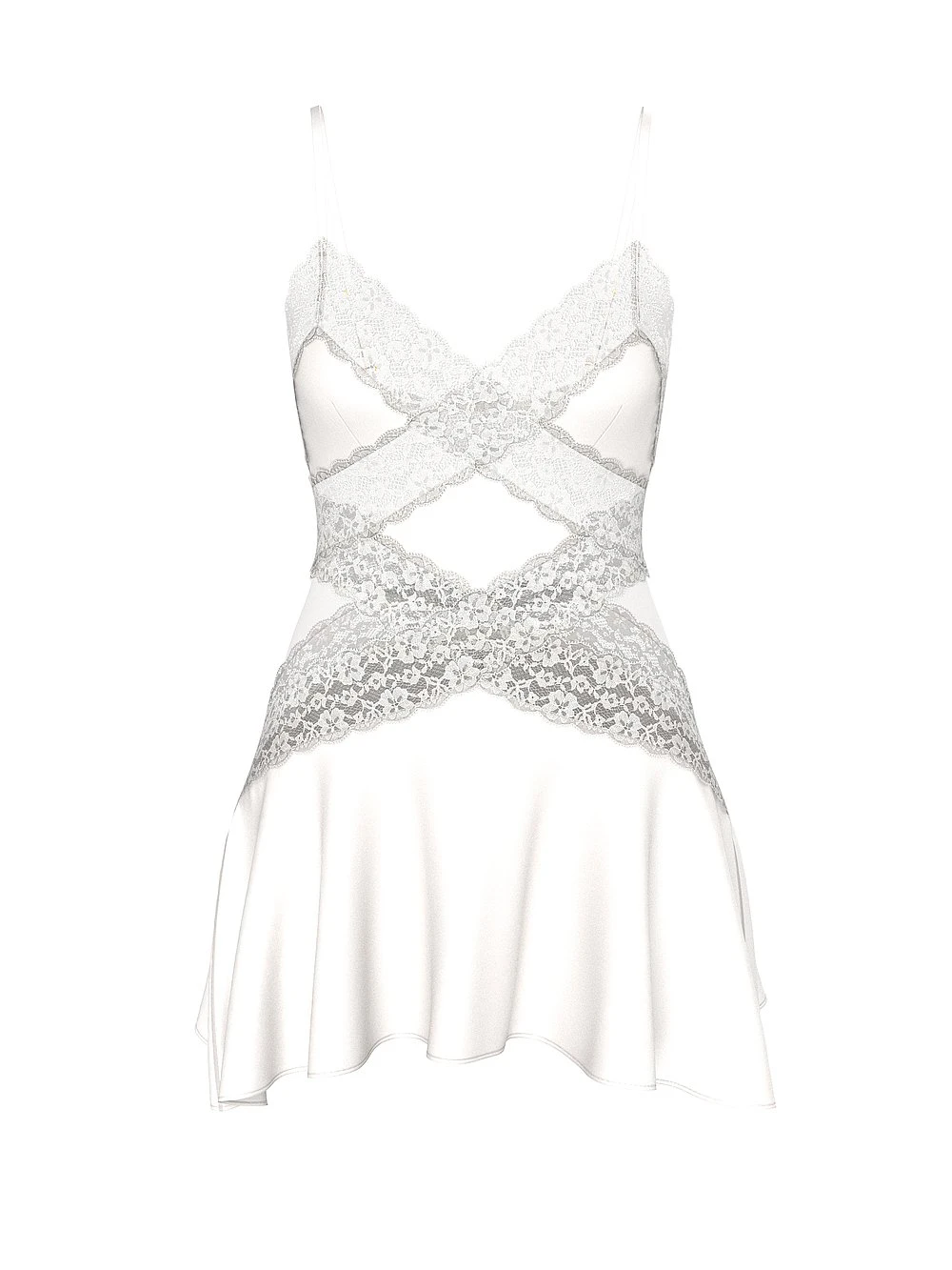 Slip into something a little more fabulous with this dreamy satin design. Sheer lace trim and tulle panels offer a sexy glimpse beneath, while the low-cut back adds more drama.