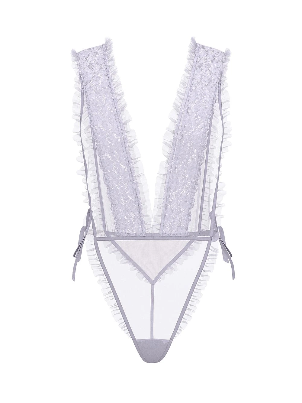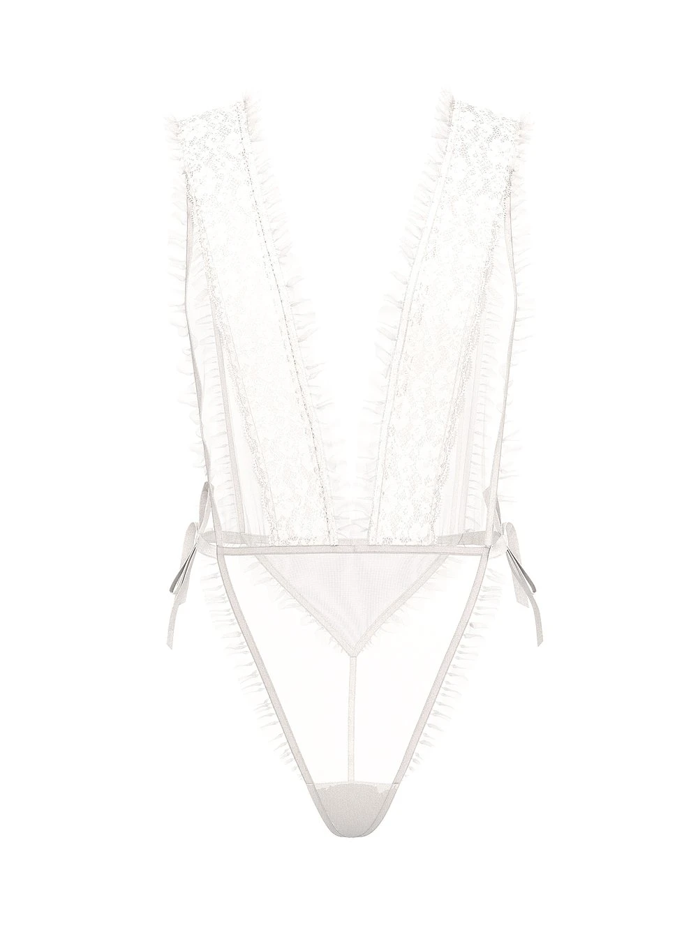 Sheer and super-seductive, this plunging design features gorgeous lace and flirty ruffle details. The lengthening, ultra high-cut leg finishes at the waist with adjustable satin ties.