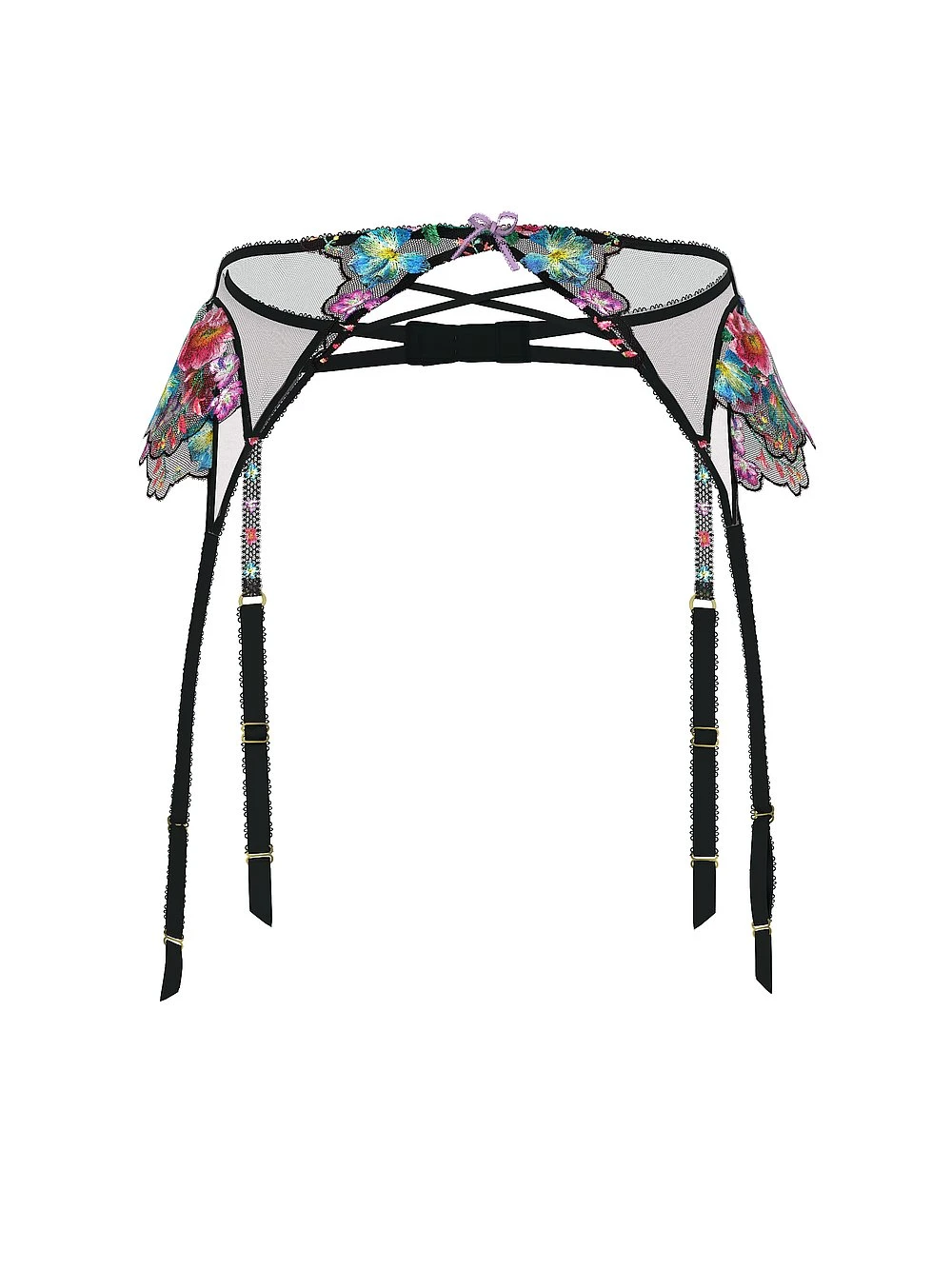 Romance blossoms in an array of moody blooms embroidered on sheer tulle mesh on this sexy and dramatic Garter Belt.