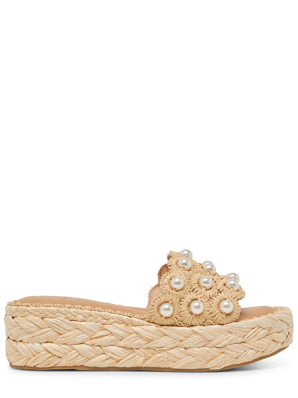 Slide into CAPER PEARL. From an espadrille-inspired sole to a pearl embellishments at the toe, this raffia-coated platform sandal is all about texture and detail.
