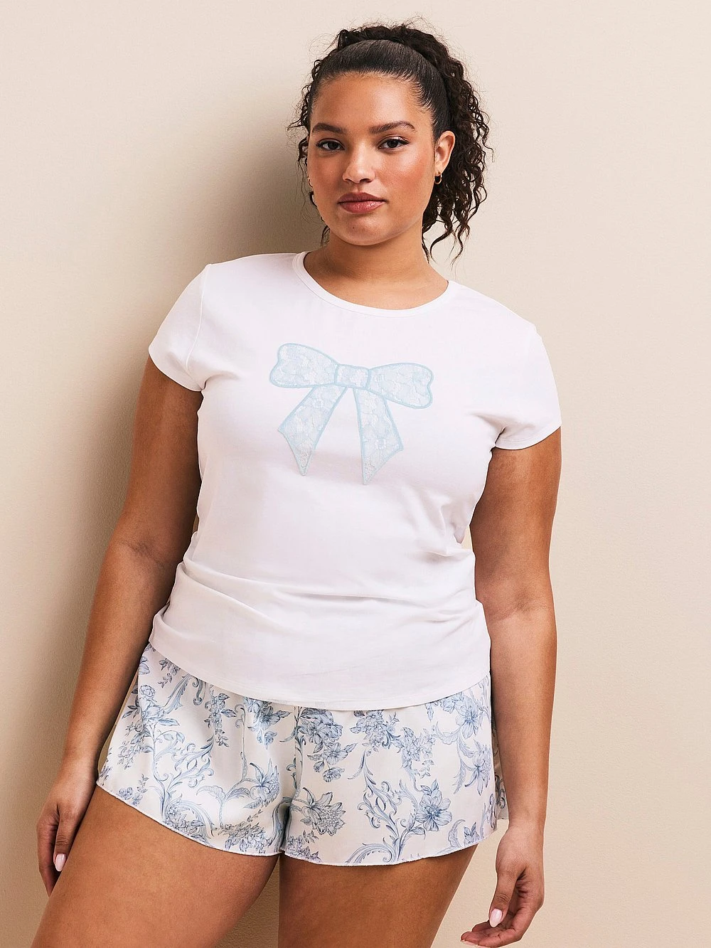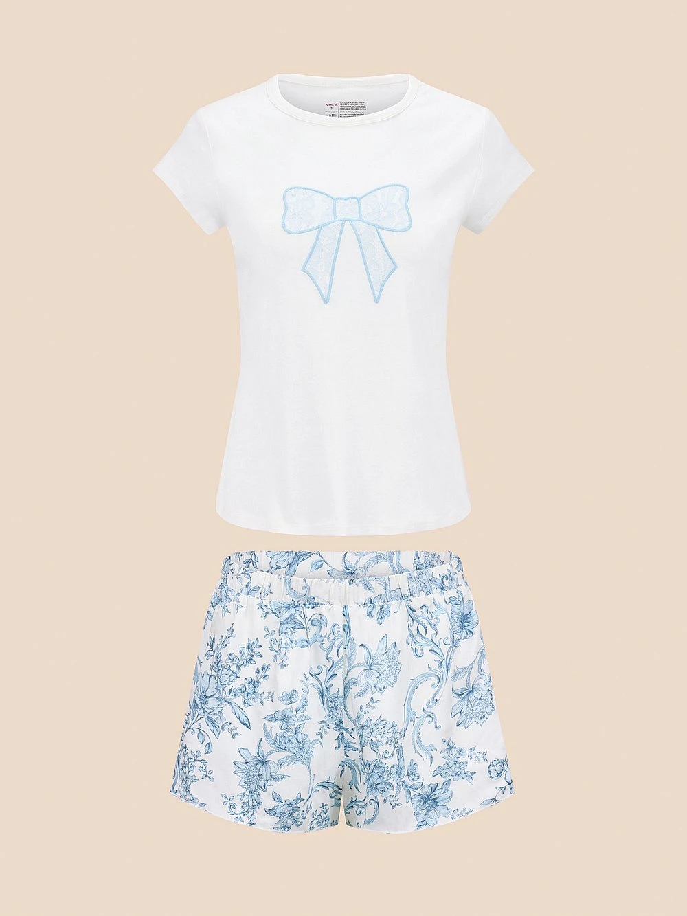 Add a touch of romance to your sleepwear, with a soft knit t-shirt with bow applique and satin shorts with an elastic waistband.