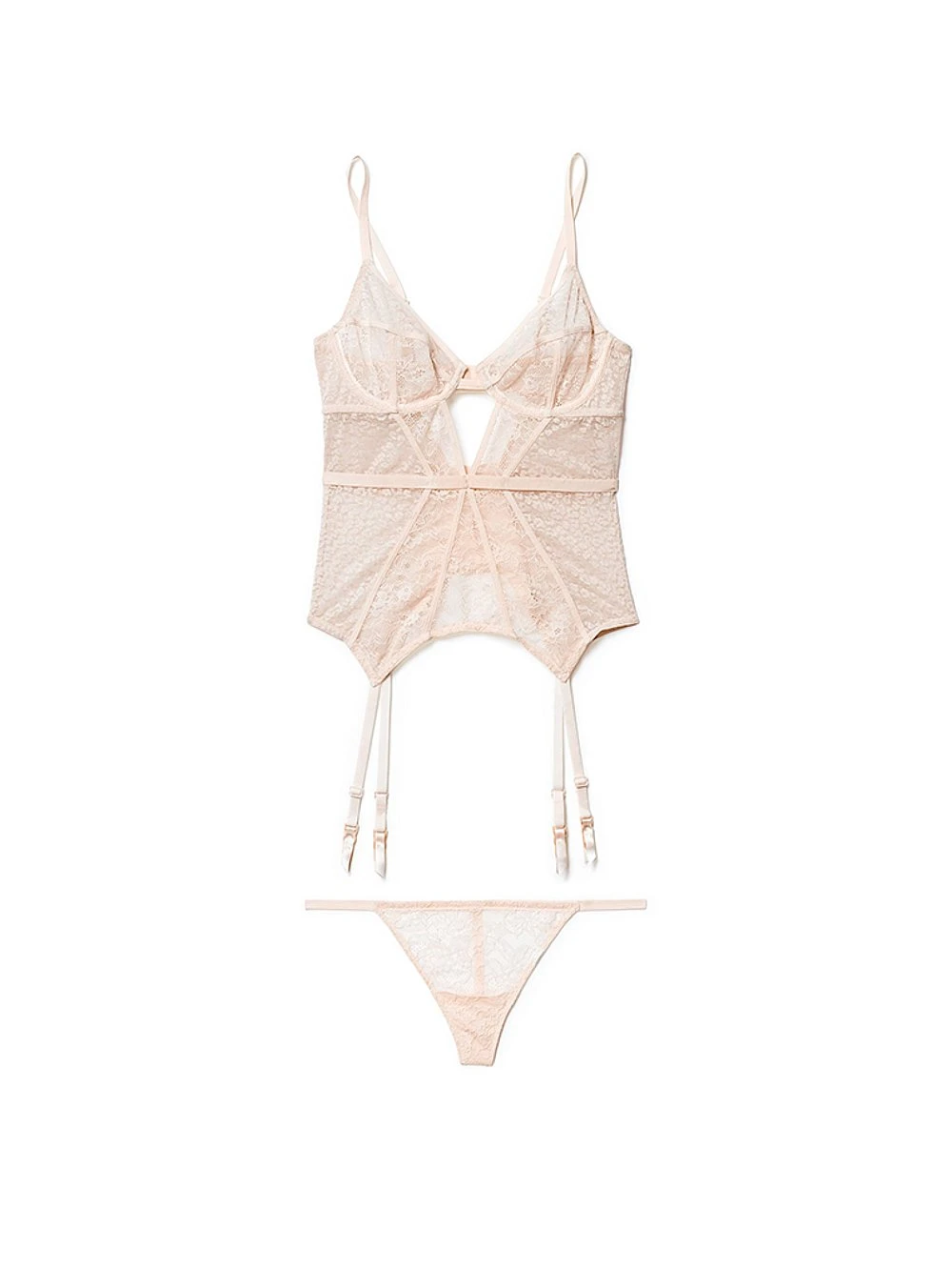 This one’s on the wild side with both floral and leopard lace, sheer unlined demi cups, and front-and-back cutouts.
