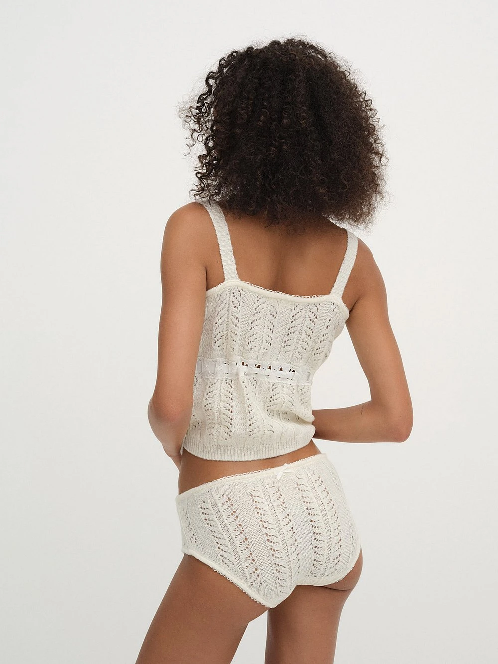 Cozy, coquette, and oh-so-cute, spend your days wistfully daydreaming in this sweet, knitted Top that features intricate rosette embroidery, eyelet trim, and a self-tying ribbon detail at the bust. Pair with the Nathalie Panty and Robe for the complete look.