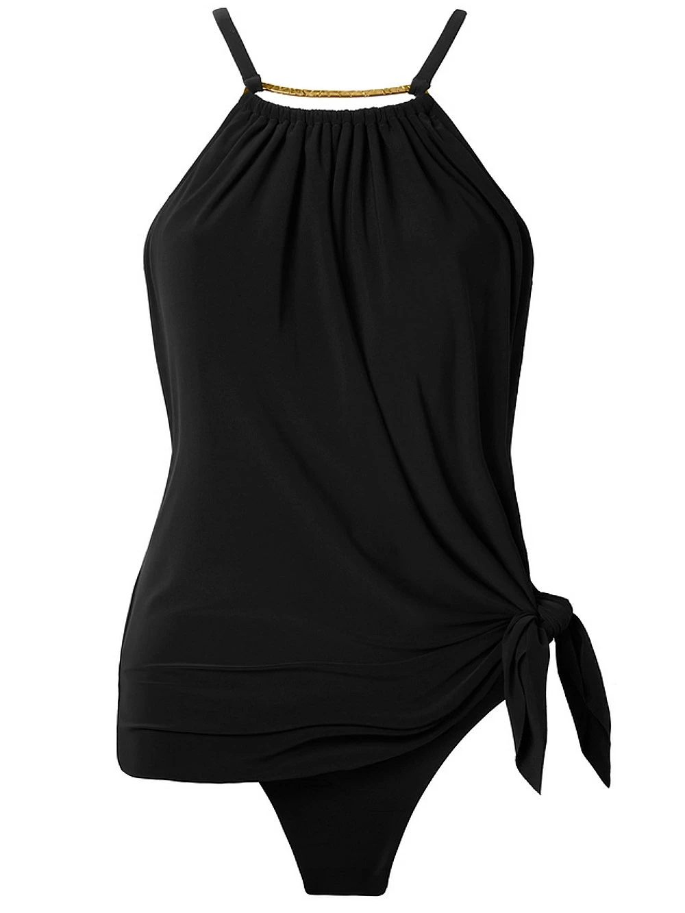 A glamorous, gold-tone chain at the neckline adds a chic feel to this flattering Swim style that provides allover slimming control. Wear as a Dress for full coverage or tie the side-slit detail for a playful finish.