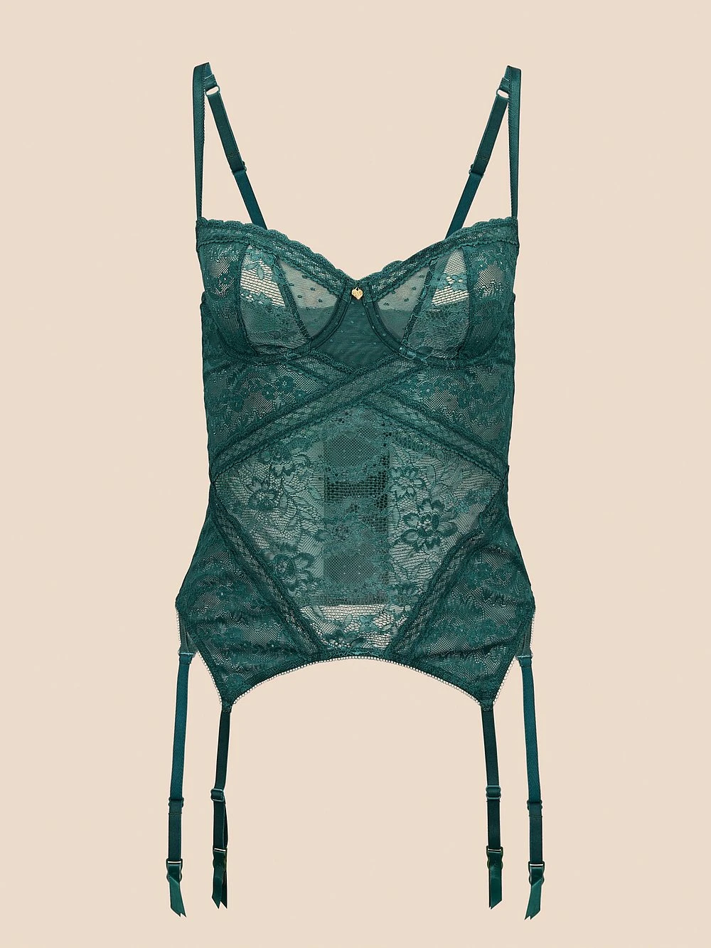 Inspired by vintage finds, this patchwork-and-lace Corset has a supportive underwire, fully adjustable straps, and a hook-and-eye back closure.