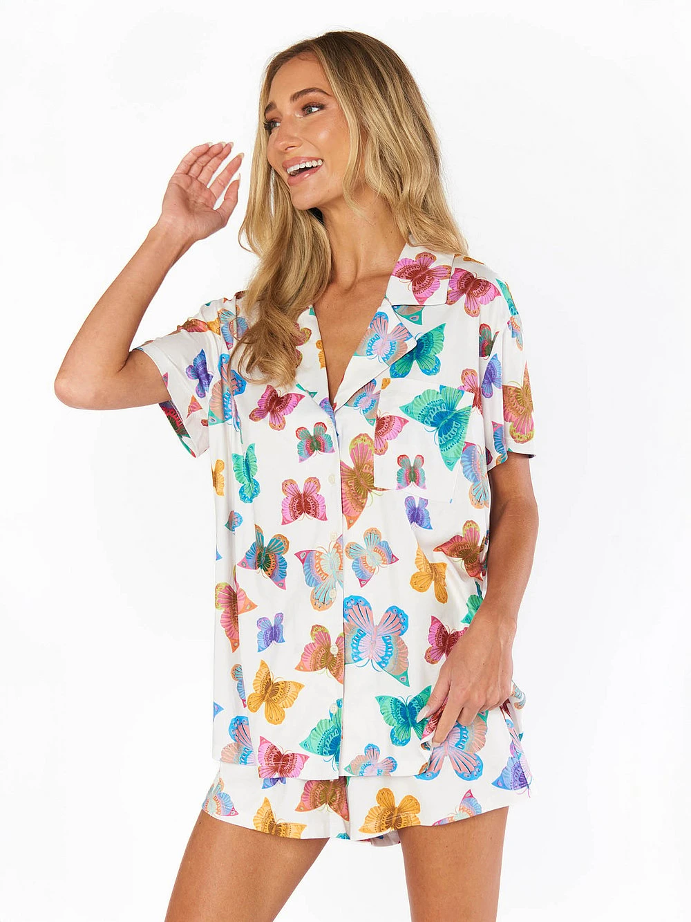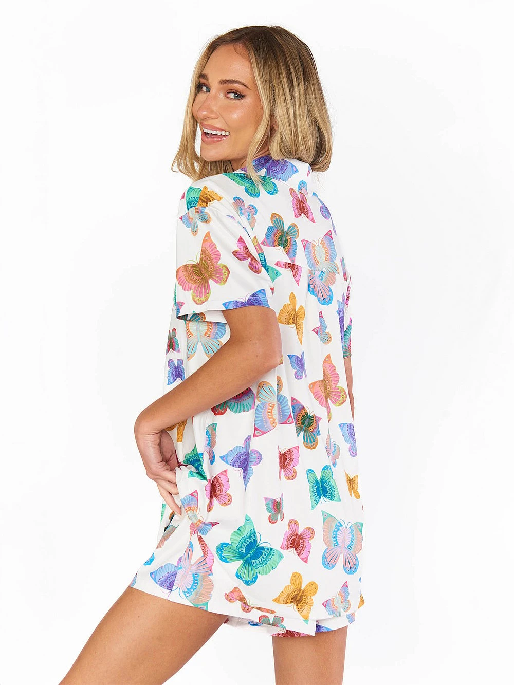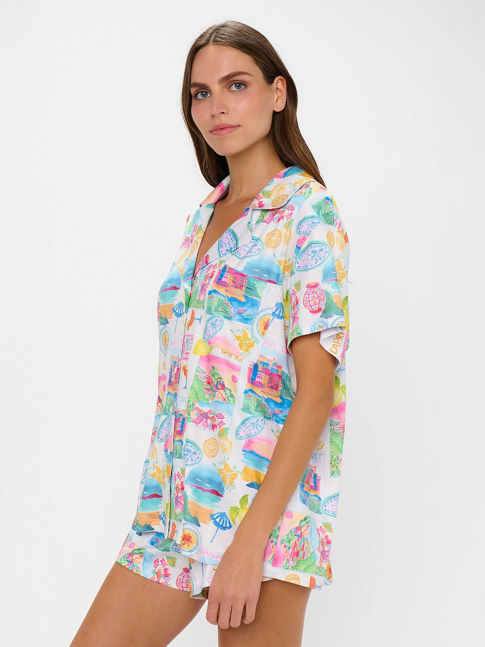 - Top: notched collar, button-front closure, pocket detail, short sleeves