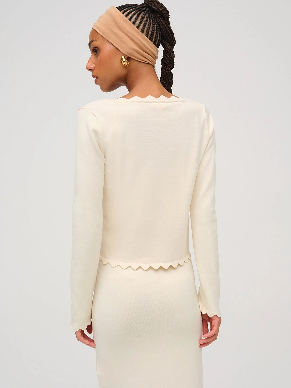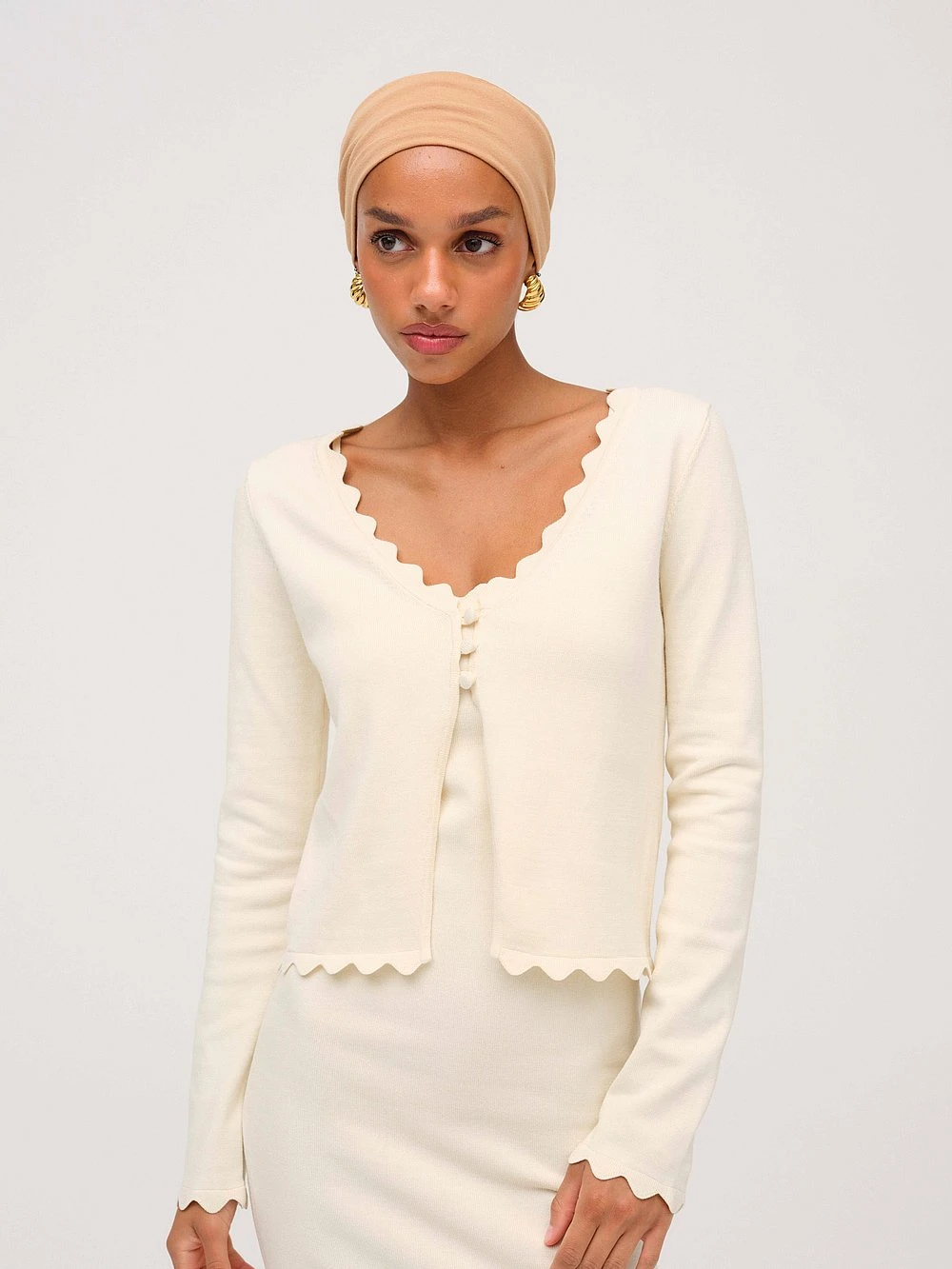 A polished Cardigan for the modern muse, this spring-ready style is crafted from a soft and cozy knitted fabric and finished with chic, scalloped details. Love to coordinate your look? Make it a match and pair with the Sisi Scallop Knit Tank.