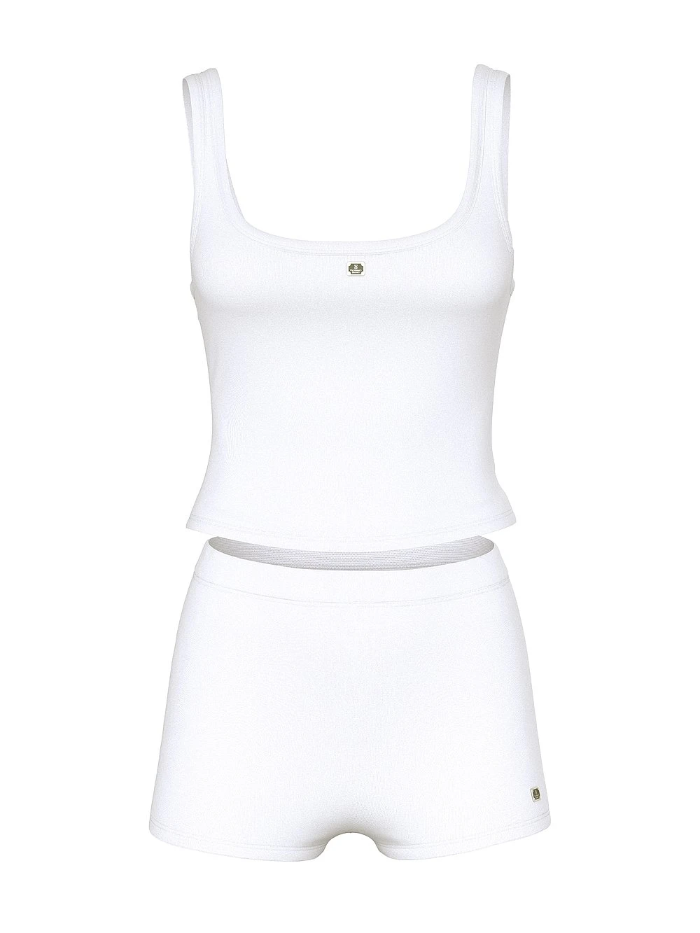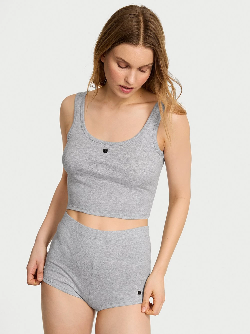 Our pure-cotton fabric is so soft and comfy, it’s just the thing for lounging and sleeping. On top, a fitted Tank with our new logo plaque hardware front and center. On the bottom, curve-hugging Shorts with an easy elastic waist.