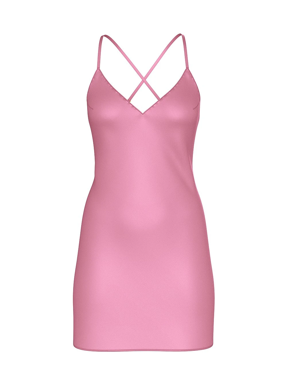 This glossy, V-neck style turns around to reveal a sexy low-cut, open back finished with delicate crossed straps.